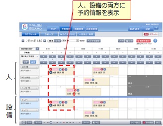 ①「スケジュール画面」に「人=施術者」と「設備」の両方を表示