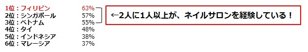 〜ビューティ総研EYE〜 【ASEAN6カ国】ネイルサロンに行ったことがある人 フィリピン・シンガポール・ベトナムでは、2人に1人以上!