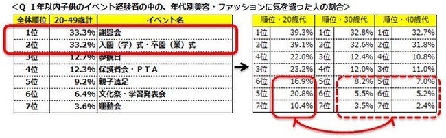 ◆もっとも美容やファッションに気を遣った子供のイベントは、ハレの日である「謝恩会」「入園(学)式・卒園(業)式」が2トップ!どの年代も3割強が意識をしている