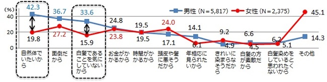 「白髪はあるが、白髪染めはしていない」人のうち、男性は「自然体でいたい」「白髪を気にしない」など、ポジティブな理由で「白髪染め」をやらないのに対し、女性は「面倒だから」「頭皮や髪に悪そうだから」が上位にあがる。