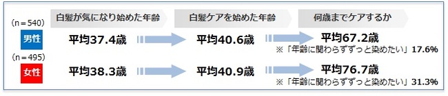 白髪が気になり始める年齢は男女共に30代後半。男性の方がやや早いが、ケアを始める年齢になると男女の年齢差はほぼ無くなる。白髪染めを続けたい年齢は、男性よりも女性の方が継続意向は高く、「年齢にかかわらずずっと染めたい」という人が3割以上と多い。