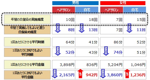 年間の白髪染めの頻度は、男性の方が多くヘアサロンが10回、自宅が18回。男女共にこまめに実施をしているが、実施しても良いと思う頻度は、女性のヘアサロン通いのみ、回数は変わらず。必要ケアとして日常に入り込んでいるようだ。