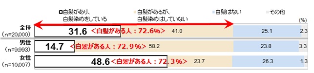 20〜69歳男女2万人にアンケートをとったところ、「白髪」がある人は男女合わせて全体の72.6%。白髪があると認識している人のうち「白髪染め」をする、しないの比率は、男性は1:4、女性は2:1。「白髪染め実施者」は男性よりも女性の方が圧倒的に割合が高く、男性の3.3倍という結果になった。
