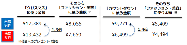 未婚男子と未婚女子は、「クリスマス」と「カウントダウン」に、「いくら」使うのか?