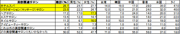 日本の美容関連サロンに行った人は「ホテルスパ」が26.7%と最も多く、続いて「リラクゼーション(マッサージ)サロン」23.5%と、リラク関連サロンが特に人気。半数が何かしらの美容関連サロンを体験している。女性においては「ヘアサロン」「ネイルサロン」にも17%前後が行った結果に。