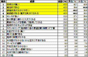 サロン利用経験者の満足度は、「非常に満足」「満足」と答えた人が9割にのぼり、感想として「技術力が高い」がトップに! 女性は、衛生面を評価する声が多く、日本のサービス水準の高さがうかがえる。