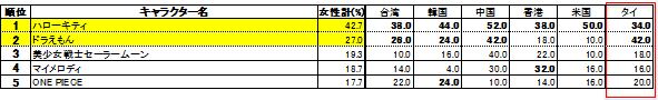 全体の5位には「アニメなどのキャラクターの絵を描く」がランクイン。アニメのキャラクターデザインの支持は「タイ」が高く、「タイ」の旅行者が描いてみたいキャラクターは「ドラえもん」が1位。その他の国はすべて「ハローキティ」が1位。