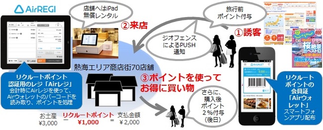 株式会社リクルートライフスタイル(本社:東京都千代田区、代表取締役社長: 北村吉弘、以下リクルートライフスタイル) は、宿・ホテル予約サイト「じゃらんnet」の会員基盤を活かし、ポイントアプリ「Airウォレット」 ( http://airregi.jp/wallet/ )と クラウドレジアプリ「Airレジ」( http://airregi.jp/ )を使った観光地への誘客・地元店舗での購買促進施策を、熱海エリアにて展開いたします。リクルートポイントが商店街で使える・貯まる「観光地O2O(Online to Offline)」モデルとして、熱海エリアの観光活性を推進してまいります。