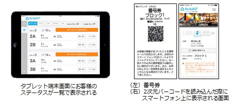 混雑状況をデータ化し、タブレット端末で一括管理することで、店員1人が来店受付から店舗への案内までを行うことができる