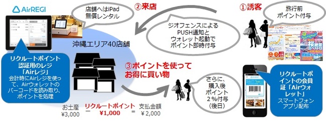 本取組みは、リクルートポイントをフックに観光客を地元店舗へ誘客し、購買を促す新しい観光活性施策です。リクルートポイント(※1)のポイントアプリ「Airウォレット」を沖縄を訪れる観光客に無料提供すると同時に、参画いただいた店舗(飲食店、土産物店等)が、クラウドレジアプリ「Airレジ」にて会計時にポイントの利用処理を行うことで、リクルートポイントが使える・貯まるようになります。