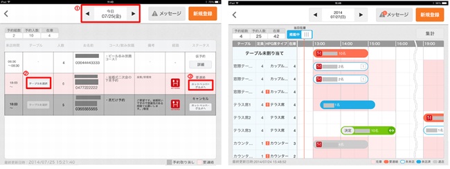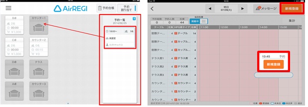 また、当日の予約状況を時間軸に沿った表示で見ることができる予約台帳のスケジュールビューを使えば、『Airレジ』で設定しているテーブル情報に基づいて、テーブルごとに予約を確認・登録することができます。