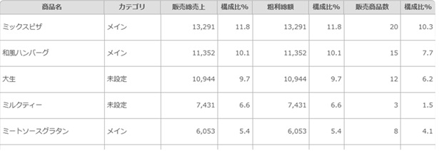 ABC分析とは、カテゴリや期間で区切って商品ごとに分析をすることで、売上改善などの目的で多くの飲食店・小売店が利用している分析手法です。期間、カテゴリ、売上、粗利、商品点数ごとにランキングを出すことができます。