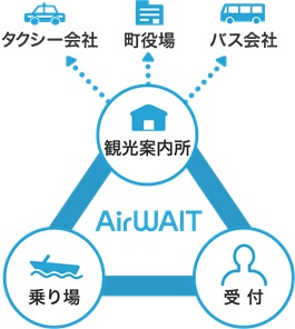- 「乗り場」「受付」「観光案内所」にタブレット端末を設置し、さらに地域の関係事業者等にはウェブで確認できる画面を用意し、自動で待ち時間情報を共有することによる業務負荷軽減