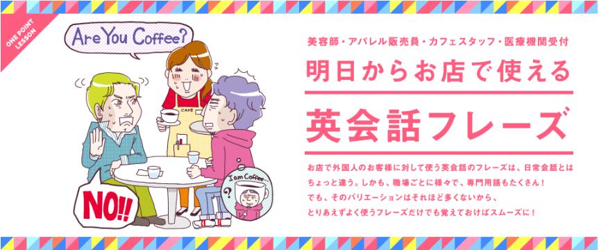 明日からでも役立つ英会話フレーズが、美容師、アパレルスタッフ、カフェスタッフ、医療従事者ごとに掲載。このフレーズを覚え、使ってみるだけでも海外の方に「語もてなし」ができるかも!?