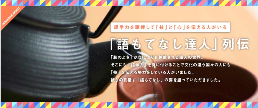 語学力を駆使して職人の技”を伝える2人の姿を紹介。「語もてなし」を実践している銀座寿司屋の大将や京都の老舗鰻店の若女将にインタビューし、英語の必要性や英語を使ったコミュニケーションの楽しさなど、経験談を掲載。
