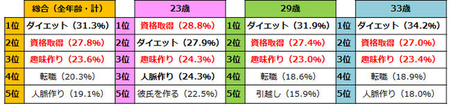 23歳、29歳、33歳の働く女性各100人に調査 2015年の新たな挑戦は1位「ダイエット」に続き、2位が「資格取得」、3位が「趣味作り」