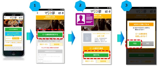 3.店舗店員が上記を確認の上、「YES」ボタンをクリックし、無料ビールを提供