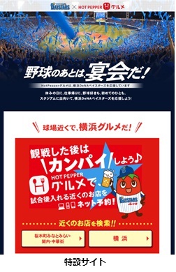 『ホットペッパー グルメ』はグルメ情報や飲食店探しはもちろん、お得なクーポン満載のネット予約ができる情報サイトです。このたび横浜DeNAベイスターズが推進する街づくりプロジェクト「I☆(LOVE)YOKOHMA」の理念に賛同し、ファンはもちろん、多くの人に試合観戦中・観戦後に楽しんでもらえる、さまざまなタイアップ企画を実施します。本拠地開幕戦となる本日3月31日より、特設サイトのオープンをはじめ、横浜スタジアムがある関内エリアを中心とした飲食店にも協力いただき、「【DeNAベイスターズ応援企画】クーポン」を発行するなど、横浜を盛り上げる企画を順次展開していきます。