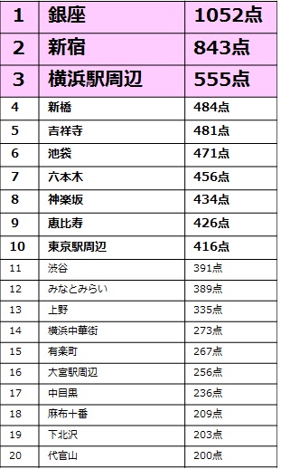 他のターミナル駅を抑え初代「飲みたい街」王者に輝いたのは銀座。世代別でも20代を除く全世代で1位を獲得する圧倒的な強さでした。選んだ理由として、「日本の中心」「一番の憧れ」「普段とは違う雰囲気を味わいたい」などのコメントも見られるように、”憧れの街”の要素が強いようです。