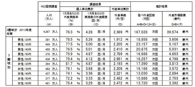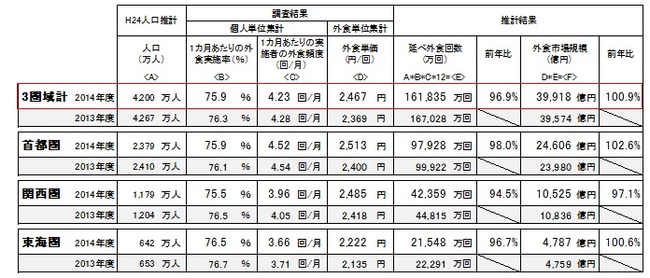 調査対象:首都圏、関西圏、東海圏の各圏域中心部からの鉄道距離が、おおむね首都圏:90分圏、関西圏:80分圏、東海圏:60分圏の市区町村に住む20〜69歳の男女(株式会社マクロミルの登録モニター)による各圏域の対象都府県内でおこなった外食が対象