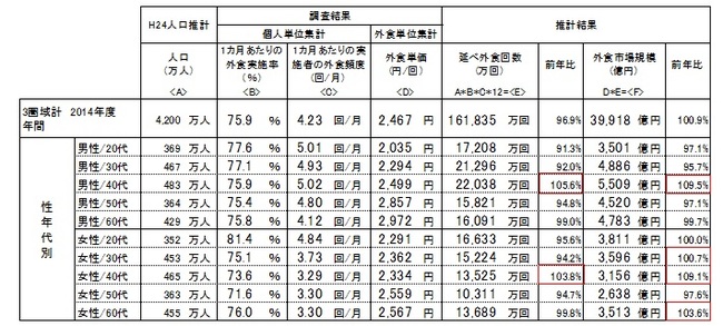 ※各性年代の人口に、1カ月あたりの外食実施率を1カ月あたりの実施者の外食頻度を乗じて、各性年代の延べ外食回数を推計。