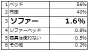 「普段寝る際に使用する家具」を調査したところ右図のような結果と なりました。日本伝統の寝具=布団がベッドに敗北するという事態と同時に、さらに注目すべきは、その地位を脅かす存在としてソファーが3位にランクインしています。“川の字に布団を敷いて家族仲良く“といった光景は姿を消し、今後は川の字にベッド、さらにはソファーを並べる時代が来る……かもしれません。