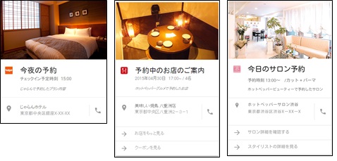 今回、『じゃらん』『ホットペッパー グルメ』『ホットペッパービューティー』の各アプリが「Nowサードパーティープラットフォーム」に対応したことで、Android端末で最新版の各アプリを利用しているユーザーは、Now カードを通じ、宿泊施設、飲食店、ビューティーサロンの予約情報を予約日の当日に受け取ることができるようになります。