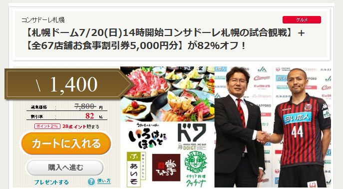 コンサドーレ札幌のSB自由席2,800円+67店舗の飲食店で使える金券5,000円分相当(税込)のご飲食にご利用できる「割引チケット」(500円分×10枚セット)の合計7,800円相当を、82%OFFの1,400円で提供します。