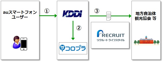 ② コロプラはKDDIからの委託を受け、位置情報データを用いた特定地域の観光動態調査・分析および調査レポートの作成を行います。なおコロプラが当レポート作成に使用するデータは、KDDIにより分析に必要な位置情報データのみを抽出し、誰の情報であるかわからない形式へ加工(位置情報とユーザーの紐づけキーのハッシュ化、位置情報の時間的空間的メッシュ化など)をされています。なお、両社間の契約において、位置情報データを委託業務以外への利用および第三者への開示、ならびに、方法の如何を問わず、auスマートフォンユーザーの特定を行わないよう、コロプラに義務付けています。