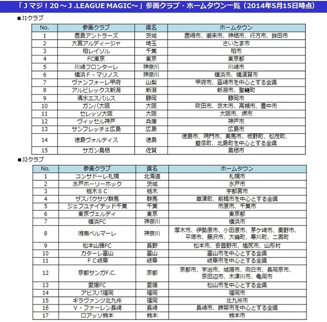 「Jマジ!20 〜J.LEAGUE MAGIC〜」参画クラブ・ホームタウン一覧(2014年5月15日時点)