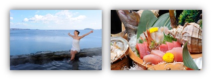 「太平洋」を「観る」景観と新鮮な海の幸をたっぷり楽しめる料理が好評の宿で、特に自慢の温泉大露天風呂から眺める水平線は圧巻です。館内のどこにいても海原に抱かれたような心地よさを感じられる宿です。