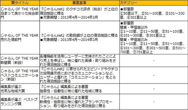 2013年度1年間で、素晴らしい実績を収められた、取り組みをされた宿泊施設に贈られるじゃらん認定の表彰です。顕著な実績を収められた「じゃらん OF THE YEAR 売れた宿部門」や口コミ評点が高い「じゃらん OF THE YEAR 泊まって良かった総合部門」、また今年新たに設けた「じゃらん OF THE YEAR 敢闘賞」「じゃらん OF THE YEAR ベストコミュニケーション」などを、ブロック(北海道、東北、関東・甲信越、東海、近畿・北陸、中国・四国、九州、沖縄)ごとに表彰させて頂きます。
