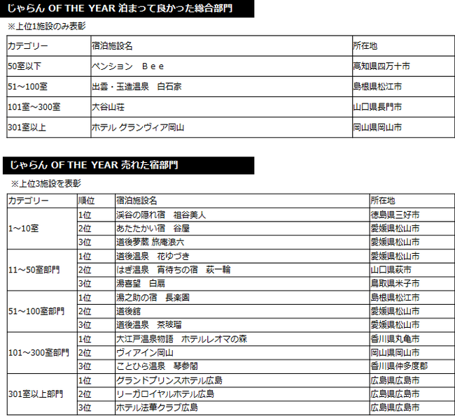 2013年度の1年間に顕著な実績をおさめた宿泊施設を表彰 「じゃらんアワード2013」 中国四国ブロック発表!