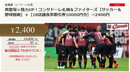 下記の日程における北海道日本ハムファイターズC指定席(2,000円)とコンサドーレ札幌SB自由席(2,800円)の観戦チケットと、札幌飲食店の金券(10,000円分)、合計14,800円相当の商品を、83%OFFの2400円で販売いたします。