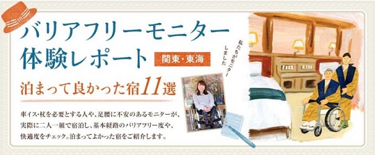株式会社リクルートライフスタイル(本社:東京都千代田区、代表取締役社長:北村吉弘)が編集を行う国内旅行誌『じゃらん』は、車イスや杖を使用される方・足腰に不安のある方が、実際に泊まってよかった宿を紹介する「バリアフリーモニター体験レポート【関東・東海・関西編】 」を、2015年3月25日(水)より旅行サイト『じゃらんnet』上に掲載することをお知らせします。なお、今後は体験レポートするエリアを順次拡大し、全国にある実際に泊まってよかった宿を紹介していく予定です。