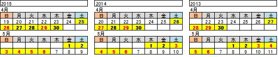 (以下の黄色い網掛け部分をGW期間と定義。日曜・祝日は赤で表記)