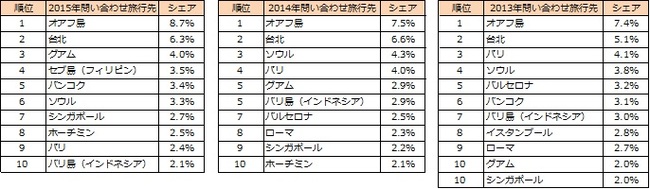 →問合せ方面1〜3位はオアフ島、台北、グアム。セブ島が4位にランクイン。