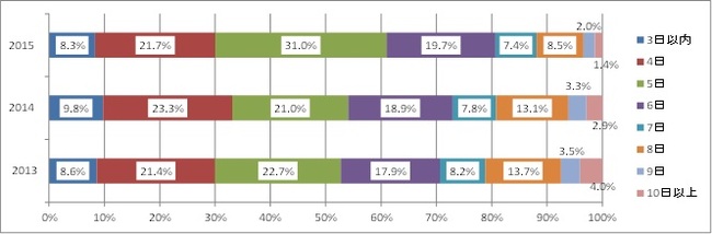 データ5:GW海外ツアー問合せシェア 日数別(2013〜2015年比較)