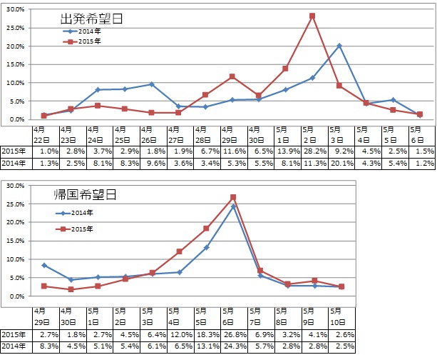 データ7:GW海外ツアー問合せシェア 希望出発日・帰国日(2014〜2015年比較)