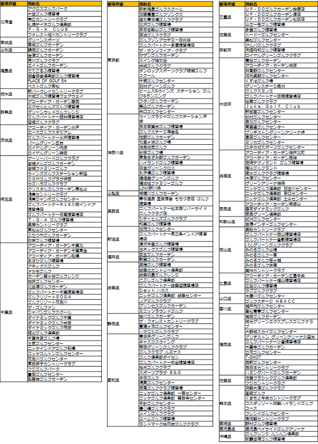 『ゴルマジ!20』 ゴルフ練習場参画一覧(2015年5月20日時点)※都道府県別 五十音順