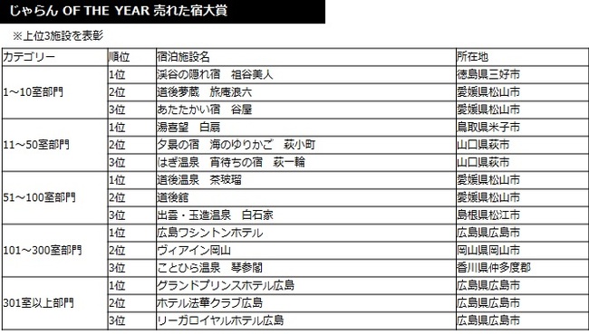 2014年度の1年間に顕著な実績をおさめた宿泊施設を表彰 「じゃらんアワード2014」 中国・四国ブロック発表!