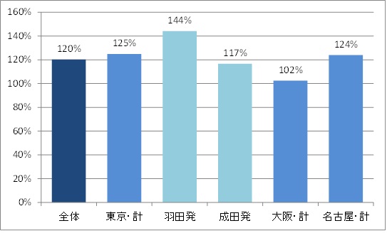 →全国計で前年比120%。特に羽田発ツアーは前年比144%の大幅増加。
