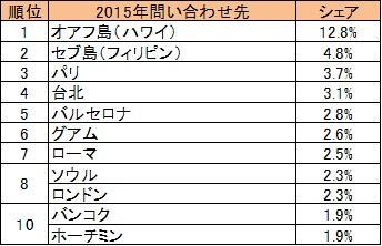 データ2:2015年夏休み期間の問い合わせ 旅行先シェアTOP10