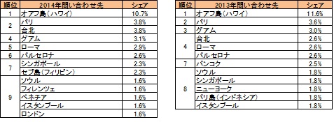 (参考)2014年、2013年の夏休み期間の問い合わせ 旅行先シェアTOP10