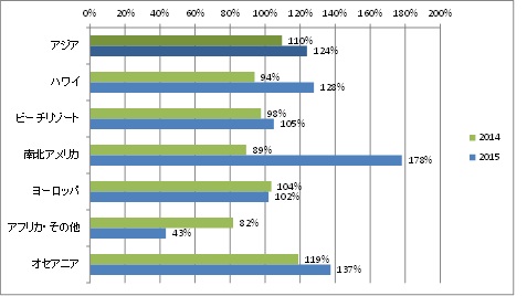 ※1 全国計、各地発とも、前年問い合わせ実績を100%としたときの、2015年の問い合わせ実績を%で表示。東京発は成田発・羽田発の合計。大阪発は関空発・伊丹発の合計。全国計には、東京、大阪、名古屋以外の発地(福岡、札幌など)を含む。