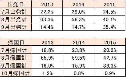 →出発・帰国希望日は、日並びのよい9月が増加し、今年の夏休みはお盆よりもシルバーウィークにピークがやってくる。