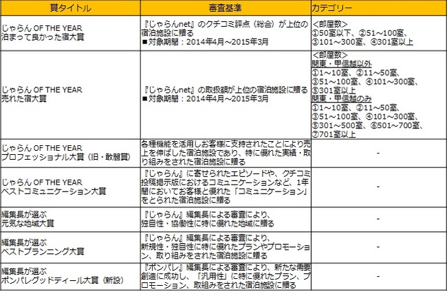 2014年度1年間で素晴らしい実績を収められ、また取り組みをされた宿泊施設に贈られる『じゃらん』認定の表彰です。顕著な実績を称える「じゃらん OF THE YEAR」では、「泊まってよかった宿大賞」「売れた宿大賞」「プロフェッショナル大賞」「ベストコミュニケーション大賞」を宿泊施設に贈ります。また今年「ポンパレ編集長が選ぶポンパレグッドディール大賞」などを新設し、全国のブロック(北海道、東北、関東・甲信越、東海、近畿・北陸、中国・四国、九州、沖縄)ごとに表彰致します。