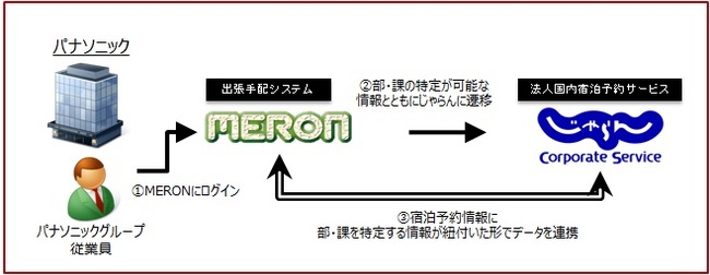 リクルートライフスタイルが運営する宿泊予約サイト『じゃらんnet』は、2009年2月より出張者のための法人専用の国内宿泊予約「じゃらんコーポレートサービス」を提供してまいりました。このたび、エムハートツーリストがパナソニックグループ向けに提供する出張手配システム「MERON」とシステム連携し、パナソニック株式会社をはじめとするパナソニックグループ約9万人の従業員向けに、「じゃらんコーポレートサービス」の提供を開始いたします 。「じゃらんコーポレートサービス」がクライアント専用の出張手配システムと連携をするのは、今回が初めてとなります。これにより、パナソニックグループは、出張宿泊の手配時にじゃらんnetの宿泊プランを利用できるようになるだけでなく、出張宿泊の予約・実績データを管理・分析できるようになります。よって、今後、各部署毎の出張傾向の把握や,内部統制の強化に利用する事も可能になります。