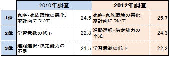 - 高校の大学・短大進学率別に「非常に難しいと感じている」割合を2010年調査と比較すると、全体が減少している中、「40~70%未満」の高校においては増加(10年38.0%→12年42.7%)しており、様々な進路志望者が混在する高校については、進路指導がより難しくなっている状況が明らかとなった。