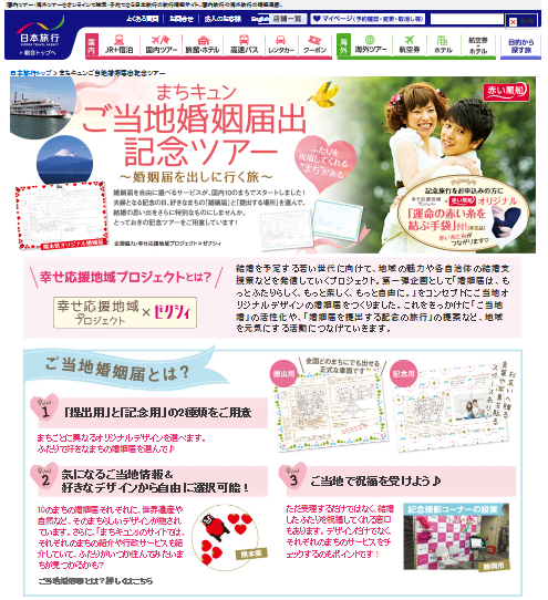 株式会社リクルートマーケティングパートナーズ(本社:東京都千代田区 代表取締役社長:冨塚 優)が運営するリクルートマーケティングパートナーズ総研が展開する「幸せ応援地域プロジェクト」は株式会社日本旅行(本社:東京都港区 代表取締役社長:丸尾 和明)と協働し、婚姻届を出すためのご当地婚姻届出ツアーを11/22(土)よりスタートすることをお知らせいたします。